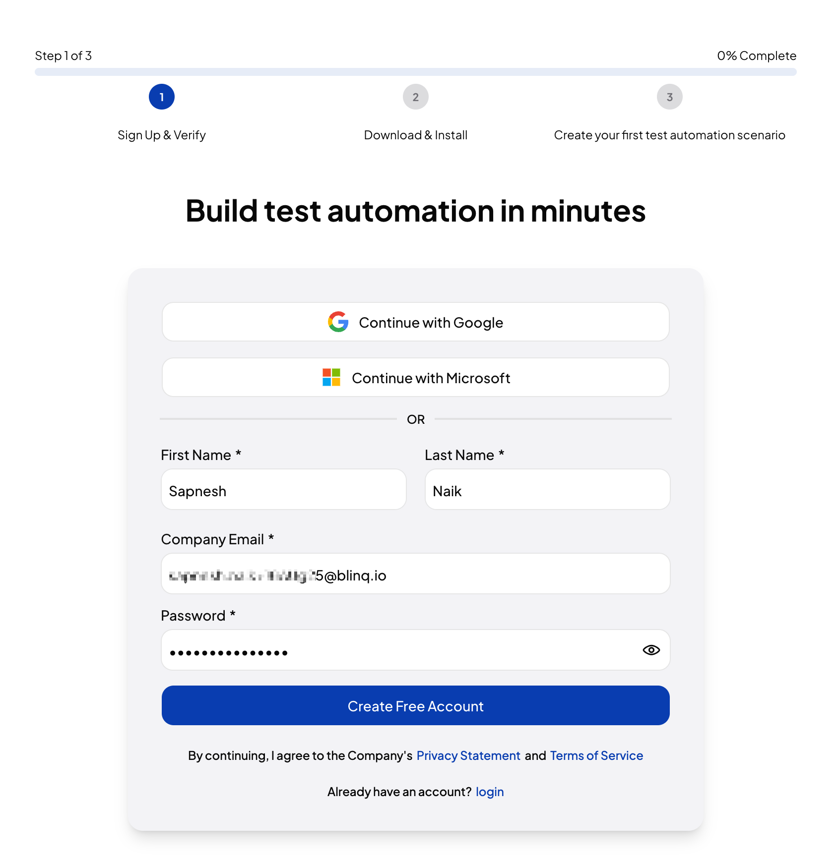 - Enter First name, Last name, Company email, and Password.