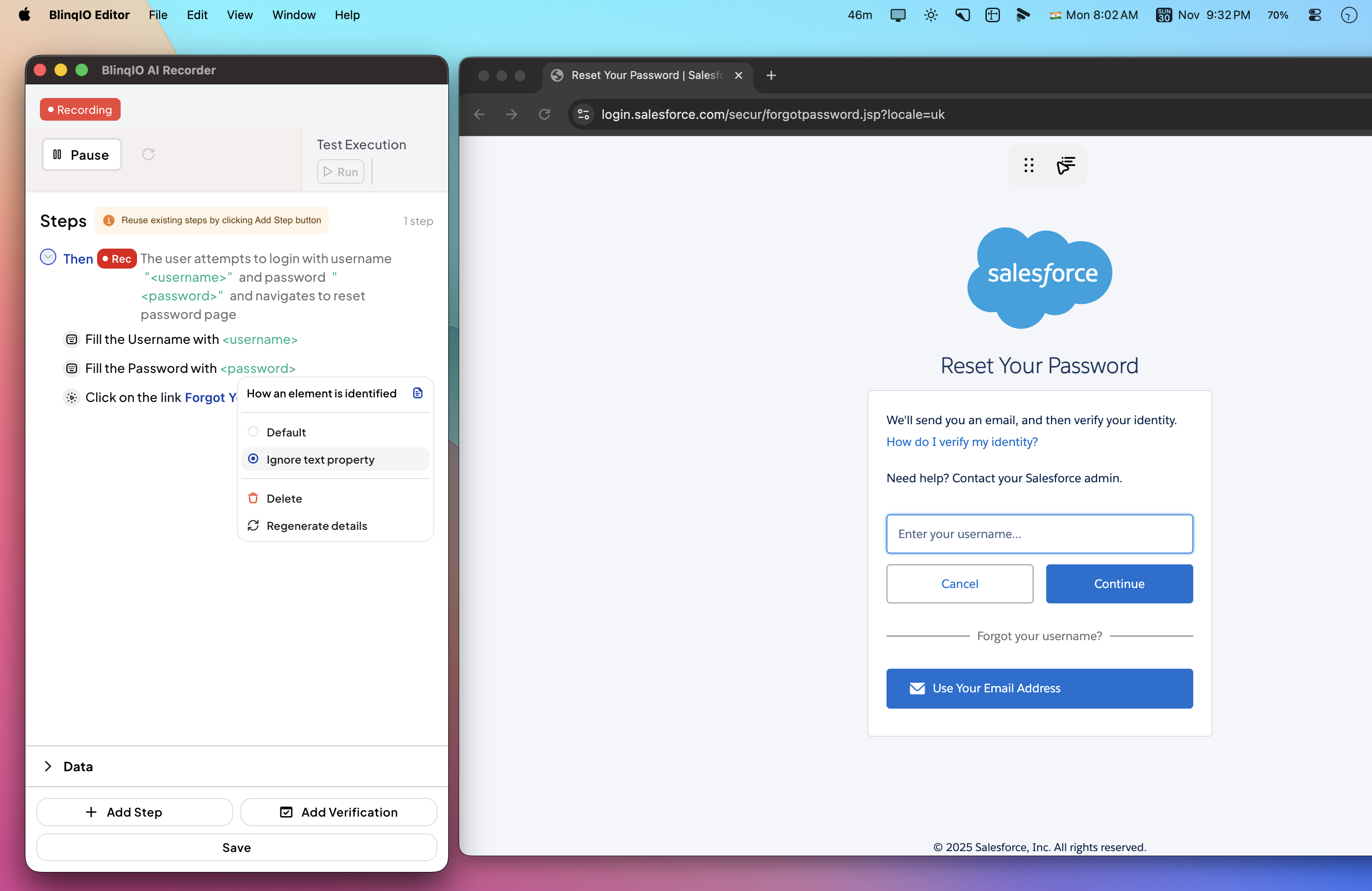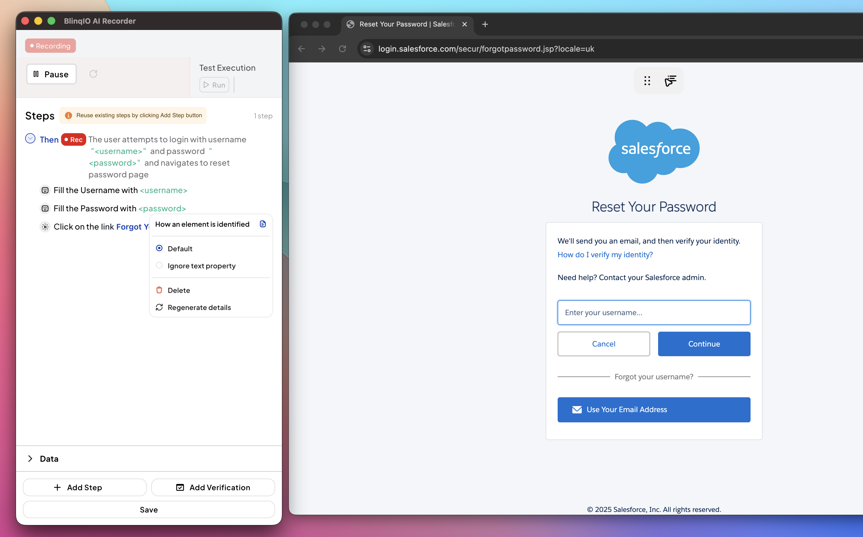 At the time of recording, AI Recorder captures your interaction and generates a CSS-based locator. Depending on the element’s properties — such as text, position, accessibility role, or context — different strategies can be used.