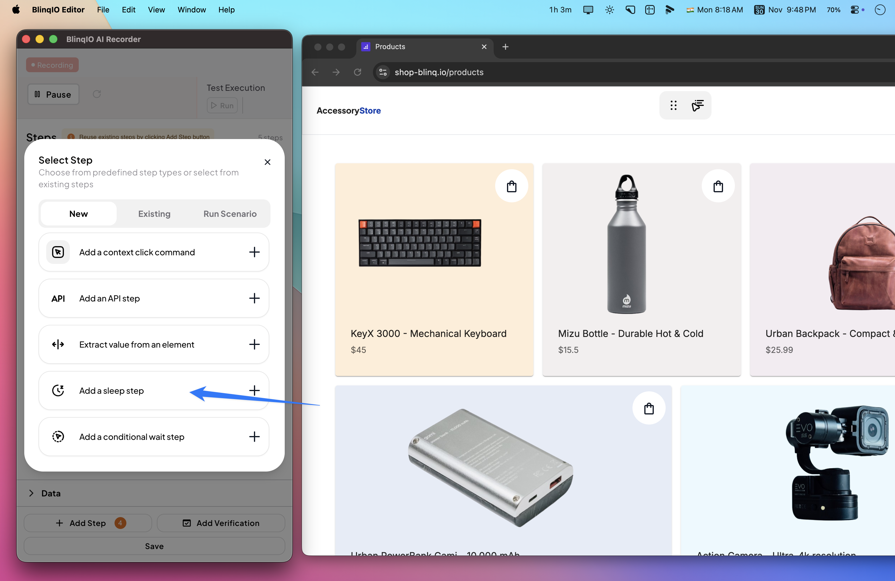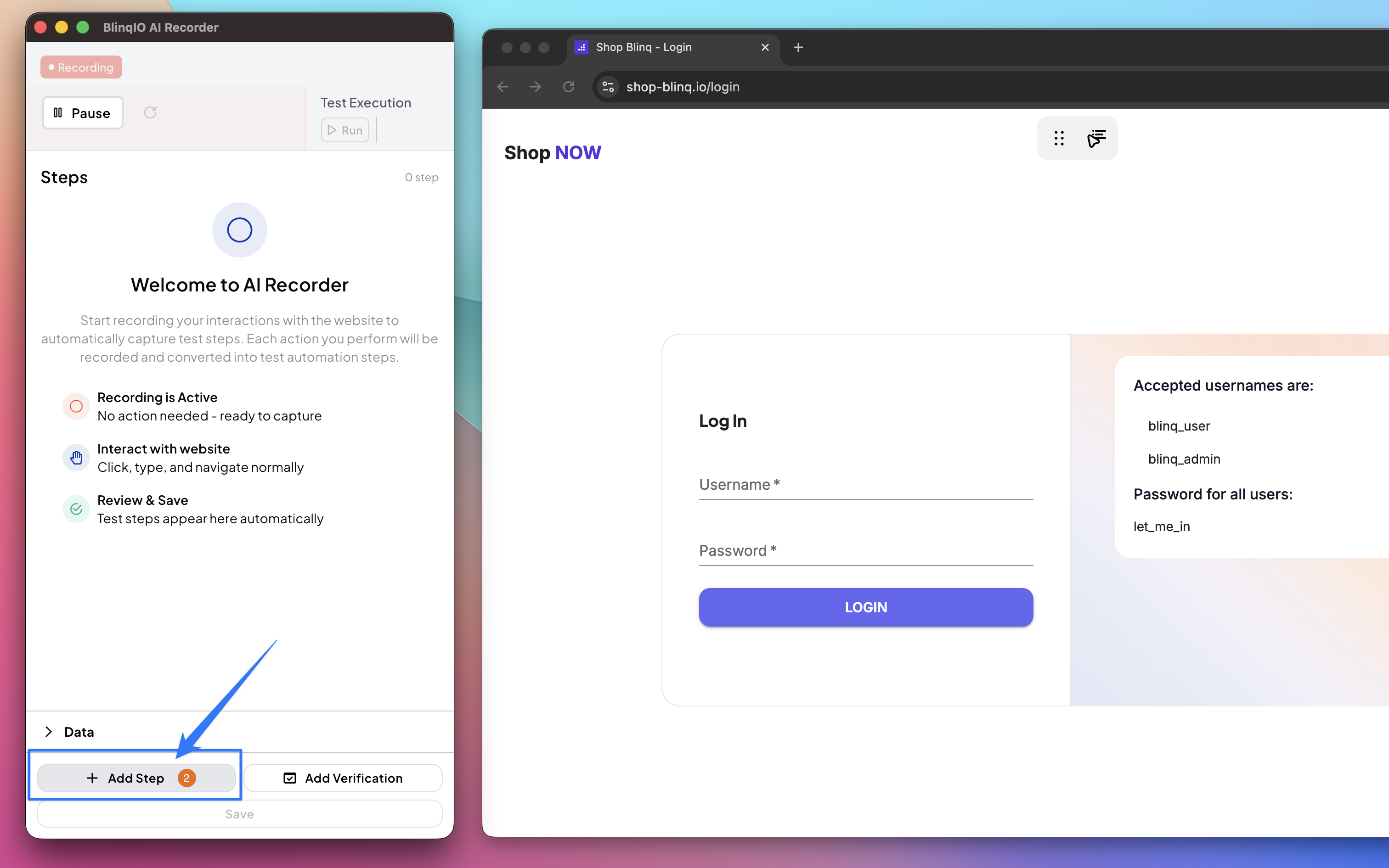 Open the AI Recorder and click + Add Step. This brings up the custom steps menu.