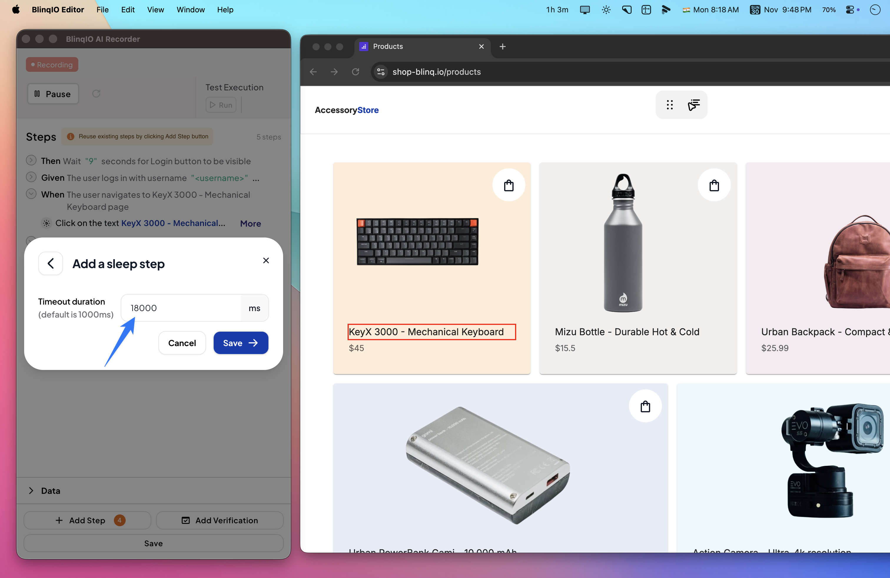 The AI Recorder provides two ways to add waits in test execution between steps:
