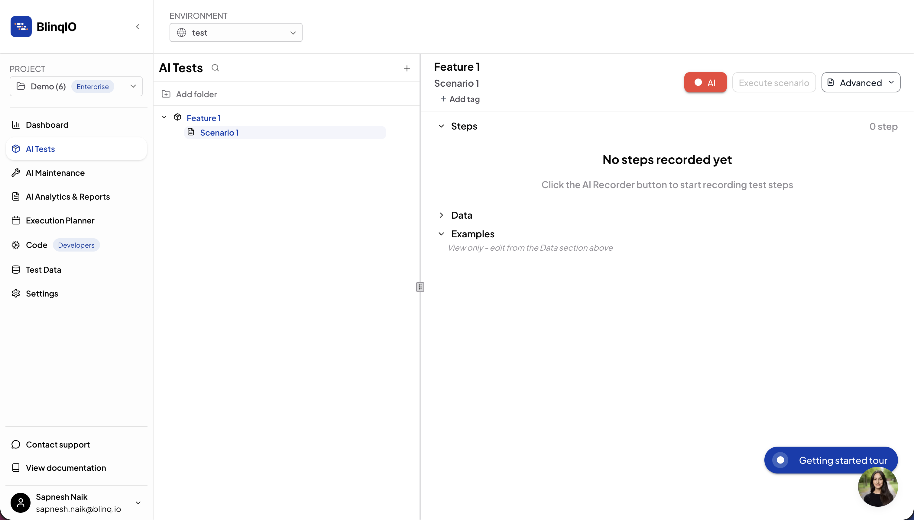 You will be navigated to the AI Tests page after the project is created.